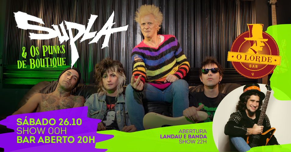 No dia 26 de outubro, o icônico Supla, uma das figuras mais marcantes do rock nacional, estreia aqui no O Lorde Bar. Com mais de três décadas de carreira, Supla traz seu estilo único que mistura punk rock e rockabilly, sempre com uma energia inconfundível. Para abrir a noite em grande estilo, teremos o show de Landau, diretamente de Minas Gerais promete aquecer o público com seu som irreverente e autêntico, Landau mistura rock, country e humor em performances enérgicas e cativantes. .